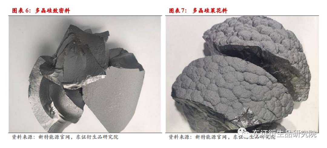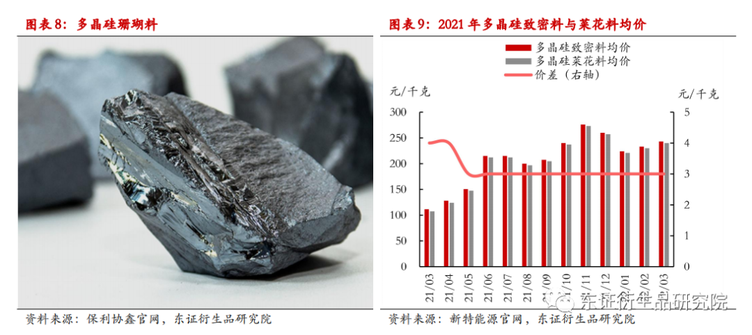 根据表面质量的不同,可划分为致密料、菜花料和珊瑚料。致密料表面颗粒凹陷程度最低,小于5mm,外观无颜色异常、无氧化夹层,价格最高;菜花料表面颗粒凹陷程度适中,为5-20mm,断面适中,价格中档;而珊瑚料表面凹陷较为严重,深度大于20mm,断面疏松,价格最低。致密料主要用于拉制单晶硅,菜花料、珊瑚料则主要用于制作多晶硅片,企业日常生产中可在致密料中掺杂不低于30%的菜花料来生产单晶硅,从而节约原料成本,但菜花料的使用会在一定程度上降低拉晶效率,企业需在两者之间进行权衡后选择合适的掺杂比例。近期致密料与菜花料的价差基本稳定在3元/千克,若价差进一步拉大,则企业在单晶硅拉制中有可能考虑掺杂更多的菜花料。