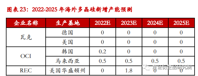 海外产能集中度较高,未来三年增产幅度及速度不及国内。海外多晶硅产能主要集中于四家龙头企业,其余皆以小产能为主。从产能规模上看,瓦克化学在海外多晶硅产能中占据半壁江山,其位于德国、美国的工厂产能分别是6万吨、2万吨,出于对2022年及之后全球多晶硅产能急剧扩张可能带来供给过剩的担忧,公司尚处于观望状态,未规划新增产能。韩国多晶硅巨头OCI在保留国内原有电子级多晶硅产线且计划于2022年达到0.5万吨的同时,正在逐步将国内的太阳能级多晶硅产线迁移到马来西亚,加上其收购的日本德山位于马来西亚的多晶硅工厂,2020、2021年OCI在马来西亚的产能达到2.7万吨、3万吨,实现了低能耗成本且逃避了中国对美、韩多晶硅的高关税,公司规划产能9.5万吨但投产日期不明确,预计未来四年以每年0.5万吨的水平增加。挪威企业REC拥有位于美国华盛顿州、蒙大拿州的两个生产基地,年产能分别为1.8万吨太阳能级多晶硅、0.2万吨电子级多晶硅,2019年我国针对美国多晶硅的双反政策出台后,早已深陷财务困境的REC选择停产,而后受到2021年多晶硅价格景气刺激,公司决定于2023年底实现华盛顿州项目1.8万吨、蒙大拿州0.2万吨的重新投产,2024年可完成产能爬坡。Hemlock是美国最大的多晶硅生产商,主营高纯电子级多晶硅,生产的高技术壁垒导致公司产品在市场上难以被替代,结合公司并未计划几年内新建项目,预计公司产能将在2022-2025年保持在1.8万吨。此外,2021年以上四家企业之外的企业新增产能为0.5万吨,由于缺乏对所有企业投产计划的了解,因此这里假设2022-2025年每年新增产能0.5万吨。