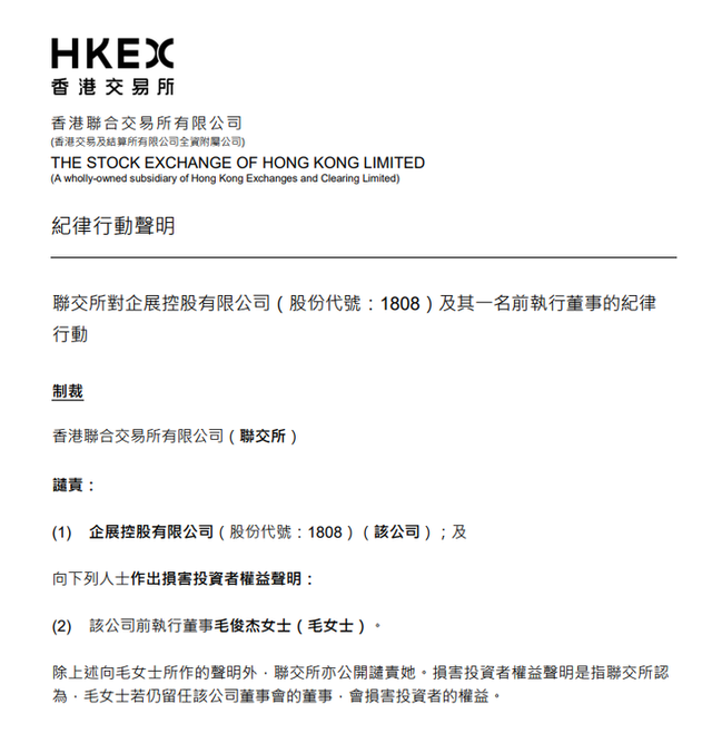 7月18日,香港联交所发布公开谴责声明,认为毛俊杰若仍留任为该公司董事会的董事,会损害投资者权益。最终,企展控股及毛俊杰通过和解方式承认其各自的违规行为,并接受了相关制裁。