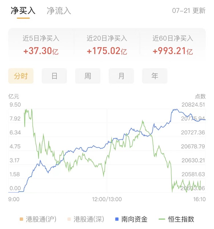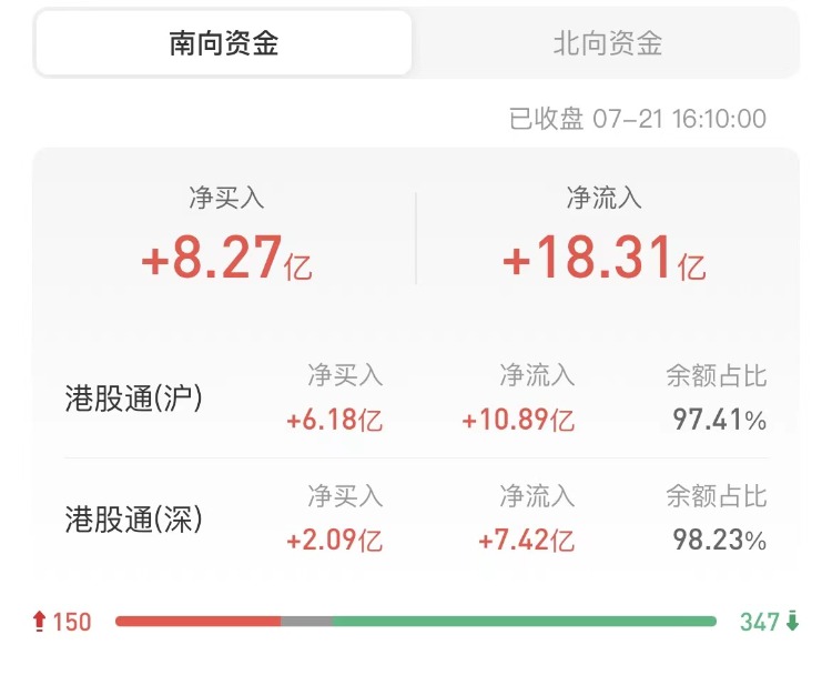南下资金今日净买入港股8.27亿港元,其中港股通(沪)净买入6.18亿港元,港股通(深)净买入2.09亿港元。上一交易日净买入港股10.12亿港元。