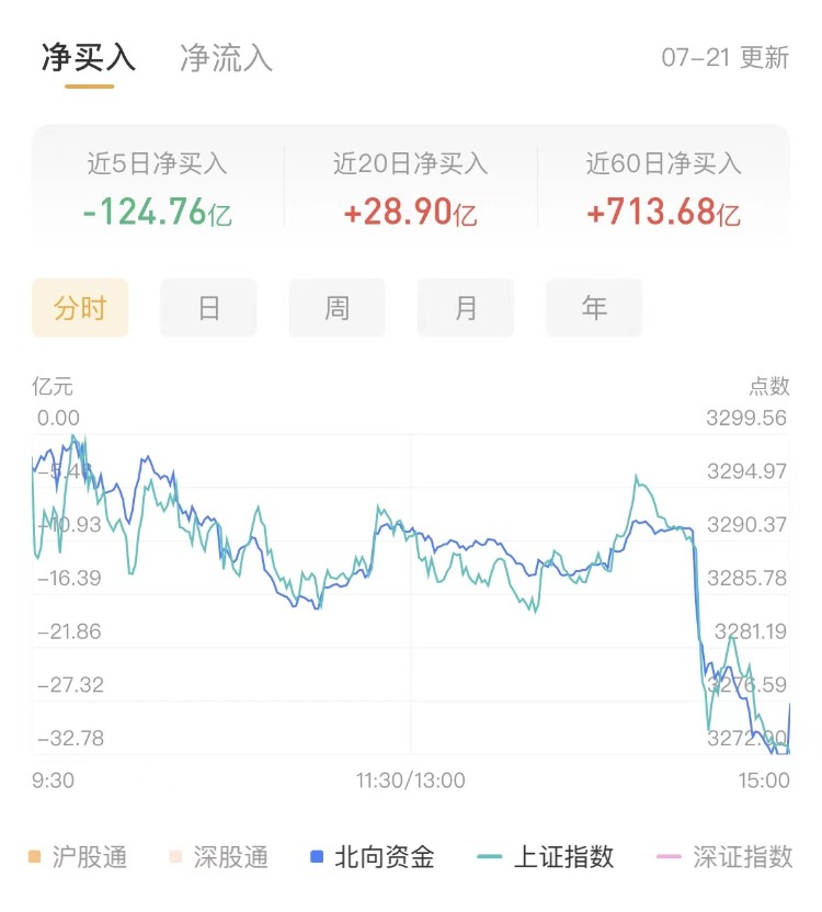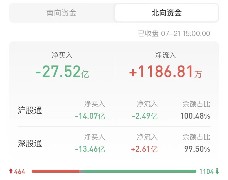 北上资金今日净卖出27.52亿元,沪股通净卖出14.07亿元,深股通净卖出13.46亿元。上一交易日净买入36.78亿元。