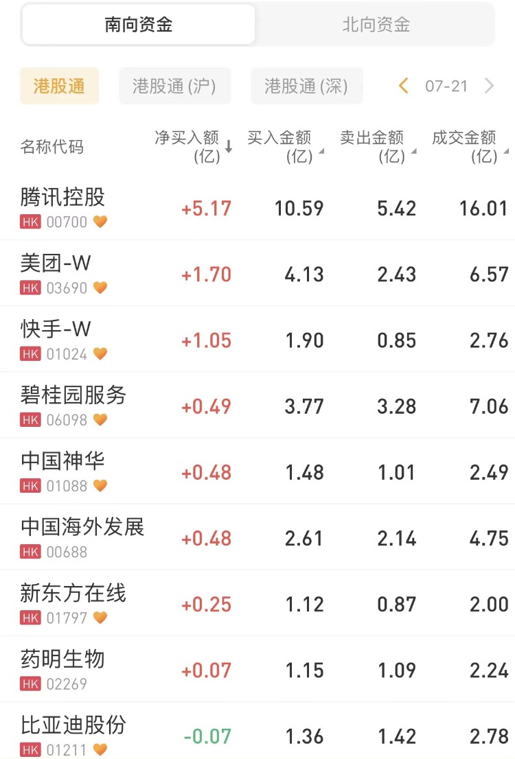 南下资金净买入腾讯控股5.17亿港元,为今日买入之最。此外,南下资金净买入美团1.7亿港元,净买入快手1.05亿港元。