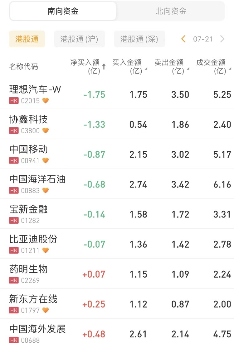 南下资金净卖出理想汽车1.75亿港元,为今日卖出之最,净卖出协鑫科技1.33亿港元。