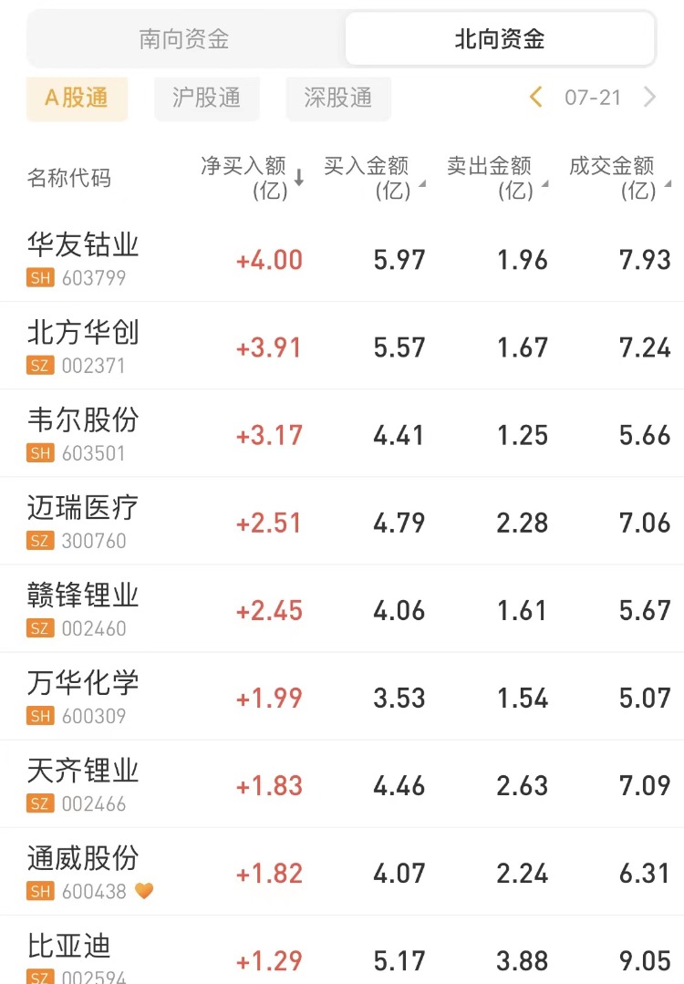 北上资金今日净买入华友钴业4亿元,为今日买入之最;净买入北方华创3.91亿元。