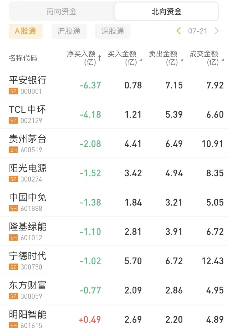 今日北上资金净卖出平安银行6.37亿元,TCL中环遭净卖出4.18亿元。