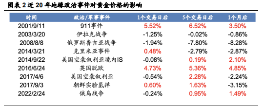 不过金价的表现在历次地缘政治中并不完全一致,要取决于事件影响的广度和深度。近20年来局部地缘政治频发,如伊拉克战争期间,金价表现平稳,俄罗斯格鲁吉亚战争期间金价反而大幅下跌。可见地缘政治能否推升黄金价格需要看整个事件的广度和深度,如果有如中美俄这样的大国参与,金价可能短期被大幅推高;但如果只是局部或小国之间的事件,金价则可能表现平淡。