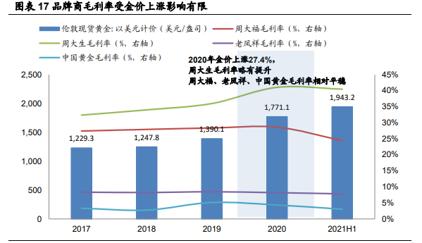 由于其处于下游,对黄金价格波动有一定的敏感性,于是各公司会采取套期保值等方式来对冲风险,或者暂时销售之前囤积的库存黄金,因此公司整体受金价波动的影响是较小的。