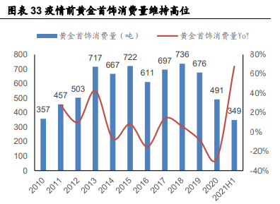 而从根本上来看,黄金下游的金饰品公司的主要属性仍是消费,当下更多的是受到疫情扰动。在疫情之前,我国黄金首饰消费量持续攀升,基本稳定在每年700吨左右。但疫情之后消费被明显限制,黄金首饰的消费量急剧下滑至500吨以下。因此,在当前国家刺激消费政策频发、疫情整体受控等背景下,黄金的抗通胀保值属性+消费属性或使得消费者更为偏好。