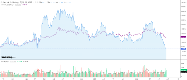 巴里克黄金(蓝色)与金价走势(紫色) 来源:英为财情