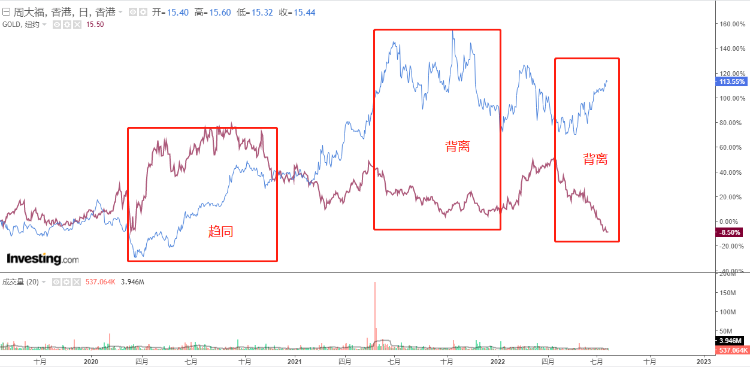 2020年初期,由于疫情突发导致全球封闭,我们可以看到巴里克黄金先是有大幅走高之势(避险),而同期周大福则出现明显下跌。随后由于股市大跌,巴里克黄金也跟随下跌。但在这之后一直到2021年初,由于全球放水对抗疫情,股市活生生被拉起来了,且当时由于避险情绪高涨,金价也升至2000美元上方,二者就呈现趋同的上涨之势。