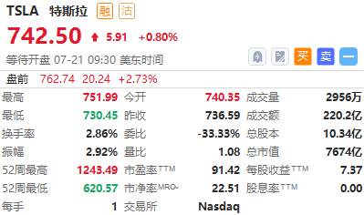 特斯拉盘前涨超2%,Q2营收大增42%超预期