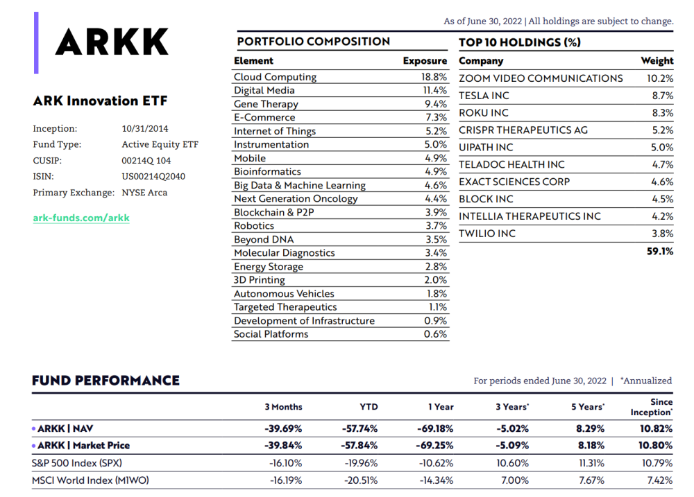 其中,木头姐管理的旗舰基金方舟创新基金(ARKK)二季度资产净值为-39.69%,远低于同期的标普500指数(-16.19%)和MSCI全球指数(-16.10%)表现。