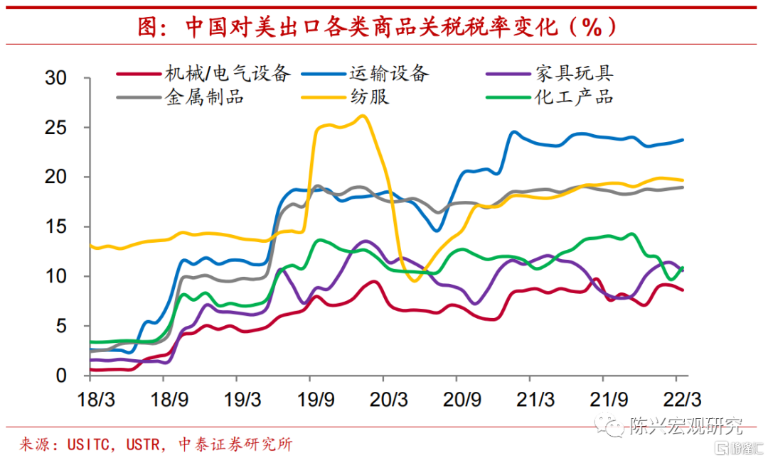 交运设备税率降幅或最大。考虑到美国在加征关税后,分批次对多类商品关税进行了豁免,所以我们进一步考察各行业实际关税的税率变化。根据税率变化情况,实际税率提升最高的交通运输设备行业在取消加征关税后,关税回落幅度或最大。而金属制品税率回落幅度或仅次于交运设备,而机械电气、家具玩具、纺服和化工产品关税税率回落幅度相对较小。