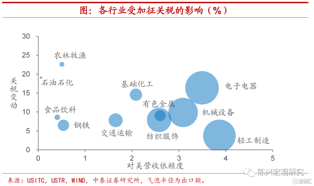 电子行业提升潜力最大。通过分析各行业实际关税税率变动和来自美国的营收依赖度,我们发现,若加征关税全部取消,则电子电器行业出口增长的潜力最大,其次是机械设备与轻工制造业。这些行业对美营收依赖度相对较高,且关税变动幅度不低,取消关税对这些行业的出口增速或有较高提升。