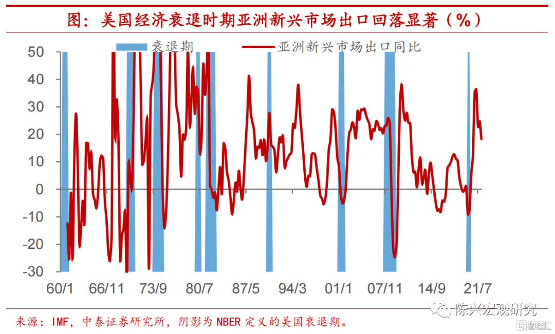 新兴市场出口增速回落同样显著。我们同样发现,在美国经济衰退时期,新兴市场经济体出口增速普遍大幅回落。如果从与中国出口的可比性角度出发,我们进一步统计了,除石油危机外的美国衰退期间,新兴经济体出口损失的程度,其中位数约在-12%左右。