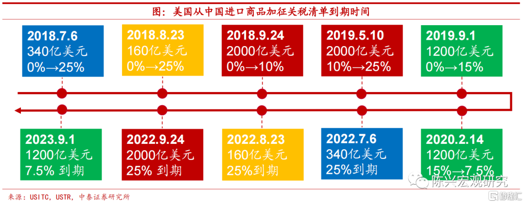 出口加征关税陆续到期。在我们同美国之间的贸易争端中,美方对我国出口商品加征关税的依据——“301调查”的有效期为4年,原340亿美元(清单1)、160亿美元(清单2)以及2000亿美元(清单3)等三个批次商品加征关税将于今年下半年陆续到期,而原1200亿美元(清单4)批次的商品加征关税将于明年9月到期。