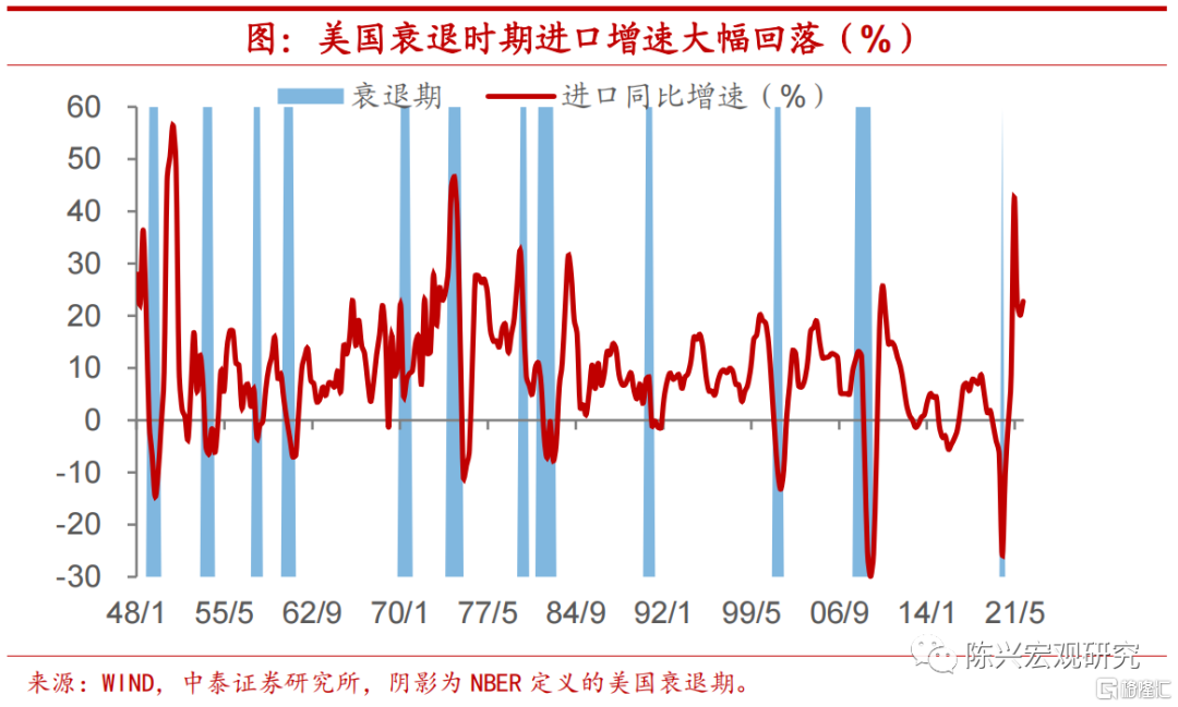 美国衰退期间进口约损失7%。梳理美国历次衰退期间的进口表现,若按中位数来看,则美国衰退期间带来的进口损失约在4%左右。而由于石油危机期间,油价飙升带动美国进口增速异常,考虑到我们更加关注中国(非石油出口国)出口受到美国需求影响,除去石油危机期间三次衰退期的相应数据,则美国衰退带来的进口损失中位数约在7%。