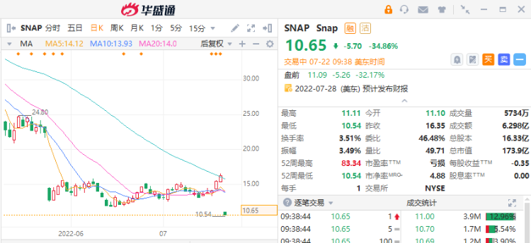 周四美股盘后,Snap发布2022年第二季度业绩。当季收入11.1亿美元,同比增长13%,低于分析师平均预期的11.4亿美元。净亏损4.22亿美元,超过亏损3.327亿美元的平均预期。而且由于经济的不确定性,公司没有发布第三季度的财务指引,只是表示“到目前为止来看,收入预计与去年相比基本持平”。