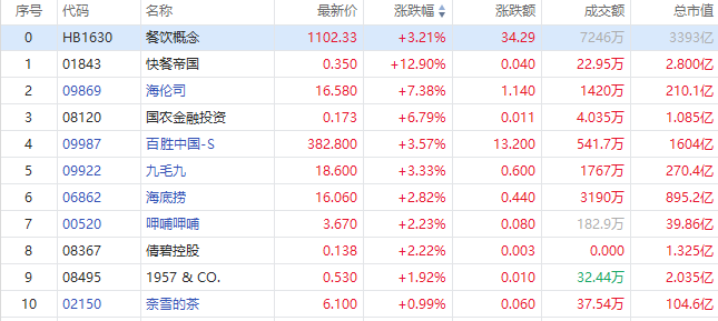 华盛资讯7月22日消息,餐饮股多数回升,海伦司涨7.38%,报16.58港元每股;百胜中国涨3.57%,九毛九涨超3%,海底捞、呷哺呷哺涨逾2%,奈雪的茶微涨。