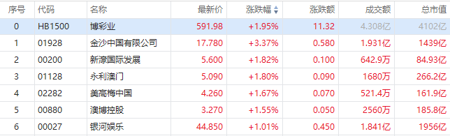 7月22日丨博彩股集体上涨,金沙中国涨3.37%,报17.78港元每股,成交额1.9亿港元;永利澳门、新濠国际发展、美高梅中国涨超1%,银河娱乐跟涨。