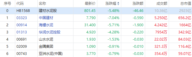 华盛资讯7月22日消息,建材水泥板块继续受压,中国建材跌7.04%,报7.79港元每股,成交额5.25亿港元;海螺水泥跌5.71%,华润水泥跌4.28%,山水水泥、亚洲水泥跟跌。