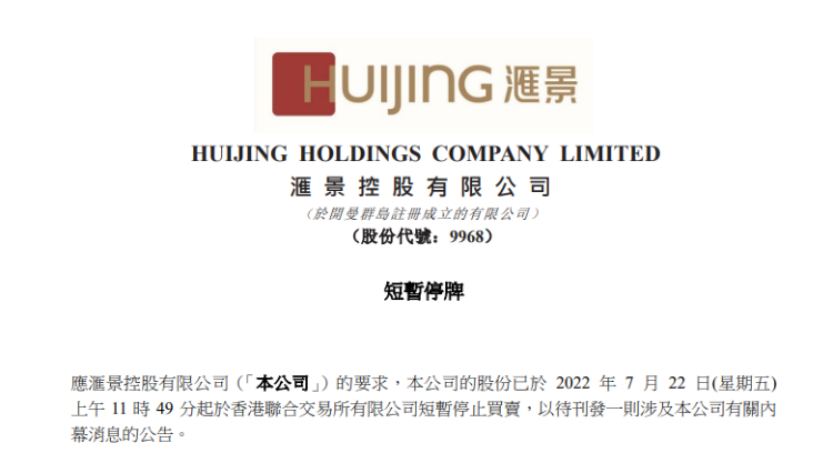 公司发布公告,公司的股份已于2022年7月22日上午11时49分起于香港联合交易所有限公司短暂停止买卖,以待刊发一则涉及公司有关内幕消息的公告。