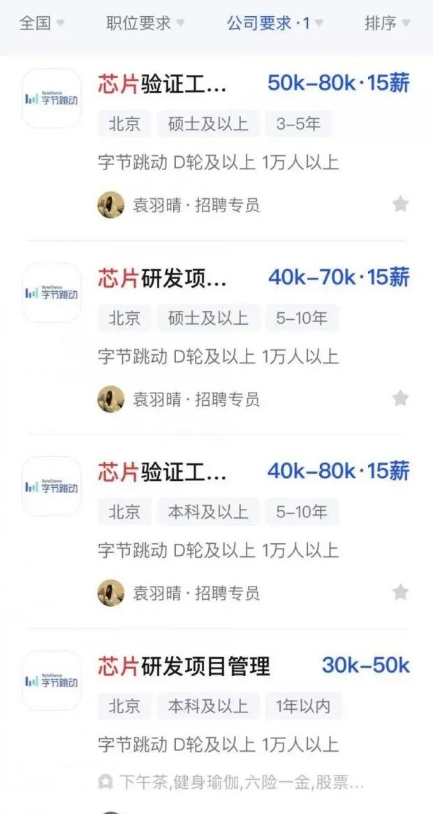 目前,在脉脉等招聘平台上,字节跳动已开放招聘超过30个岗位,包括“芯片验证工程师”、“芯片、板级热设计工程师”、芯片后端设计师”等,薪资最高达百万。