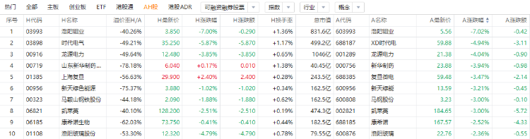 洛阳钼业A股跌7.02%,H股跌7.00%;时代电气A股跌4.94%,H股跌5.87%;龙源电力A股跌4.04%,H股跌3.85%。