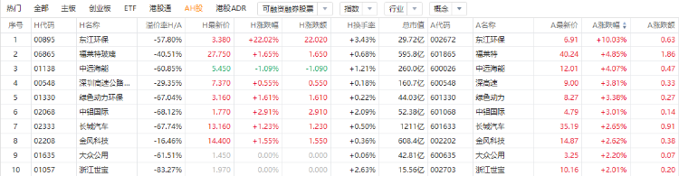 截至发稿,东江环保A股涨停,H股现涨22.02%;福莱特玻璃A股涨4.85%,H股现涨1.65%;中远海能A股涨4.07%,H股现跌1.09%。