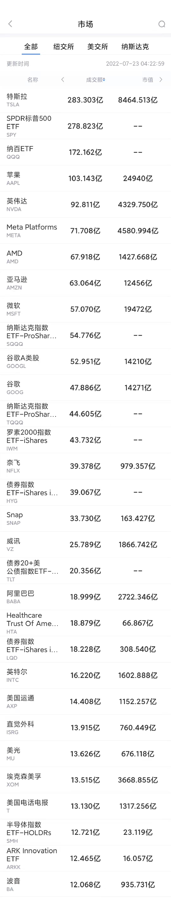 第4名Meta Platforms收跌7.59%,成交71.7亿美元。受到Snap业绩暴雷影响,周五美股社交媒体股集体下跌。由于广告业务的拖累,Snap公司二季度收入大幅低于市场预期,并宣布减缓招聘,且并未提供三季度业绩指引。