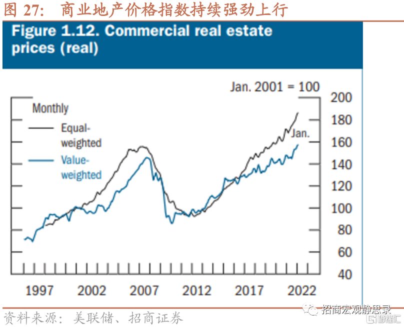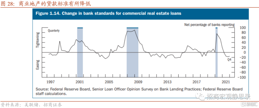 另外,美联储亦提示商业地产或估值偏高,而且贷款标准有所下降。据美联储的金融稳定报告,商业地产价格指数持续强劲涨幅,同时购买房产时的资本化率继续下降,在历史低点水平。此外,根据1月份的银行高级信贷员意见调查,2021年最后一个季度对商业地产的贷款的需求增加,并且放宽了贷款标准,虽然这可能反映了疫情冲击消退后的基本面恢复。