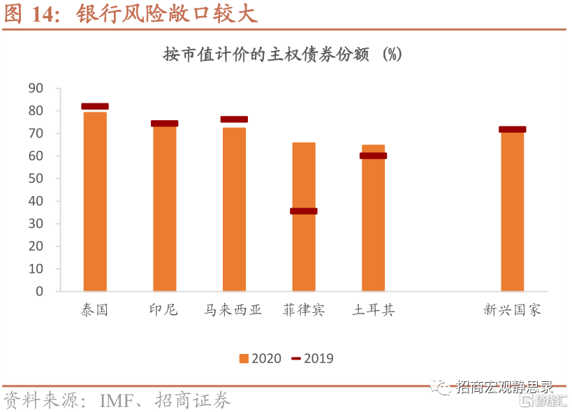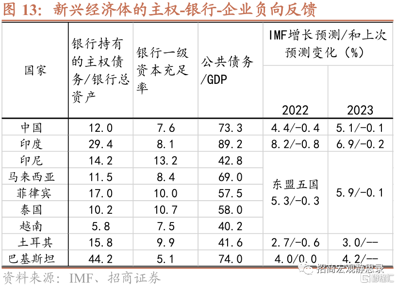 新兴经济体方面,本轮风险点源于银行对其本国主权债风险敞口跃升,以及和企业部门的负向反馈。如果新兴经济体的金融条件快速收紧,例如出现外资流出、央行在通胀压力下加息,或者增长前景恶化、风险溢价抬升,易于导致债务可持续性限制下的财政支持较快撤出;而银行所持有的主权债市值会因利差上行而压减,影响到以主权债为抵押品的贷款,出现融资成本和流动性压力;财政支持和银行贷款的突然转向会进而对企业部门造成冲击,疫情后新兴经济体的企业部门对两者尤为依赖;恶化的企业部门又会和财政、银行部门形成负向反馈。