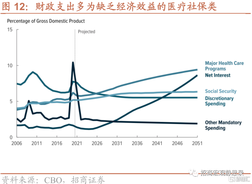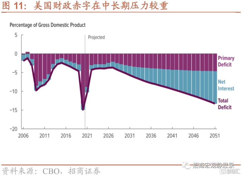 更长期来看,尽管美国国会办公室预测其财政赤字将在2023-24年从2021年10.3%GDP的二战后次高水平回落,这种调整主要是由疫情支持政策撤出和经济复苏所支撑,拜登政策的财政政策方案以针对超高收入人群的累进性税收缓和促进美国境内投资为主要方向,并不会实质性地影响企业部门投资和家庭部门消费。而且,美国国会办公室预计美国财政赤字将在中长期显著恶化:一方面,人口老龄化会致使医疗社保等强制性支出占GDP比重显著增加,且这类支出不像基建投资等会产生经济效益;另一方面,净利息支出会迅速增长,占总赤字的比例会达到一半以上(图11-12)。面对严峻形势,美国国会办公室表示,政府应对财政危机的措施主要包括三类,大幅削减赤字或增税、财政赤字货币化和债务重组,最后一种不太可能,前两者分别需要承担严重影响经济抑或推升通胀的后果。在可见的未来,大国竞争很可能是基本国际格局,因此美国很可能最终以财政赤字货币化和容忍一定通胀的路径来改善财政问题。从这个角度,其财政赤字问题对美元在中长期形成下行压力。