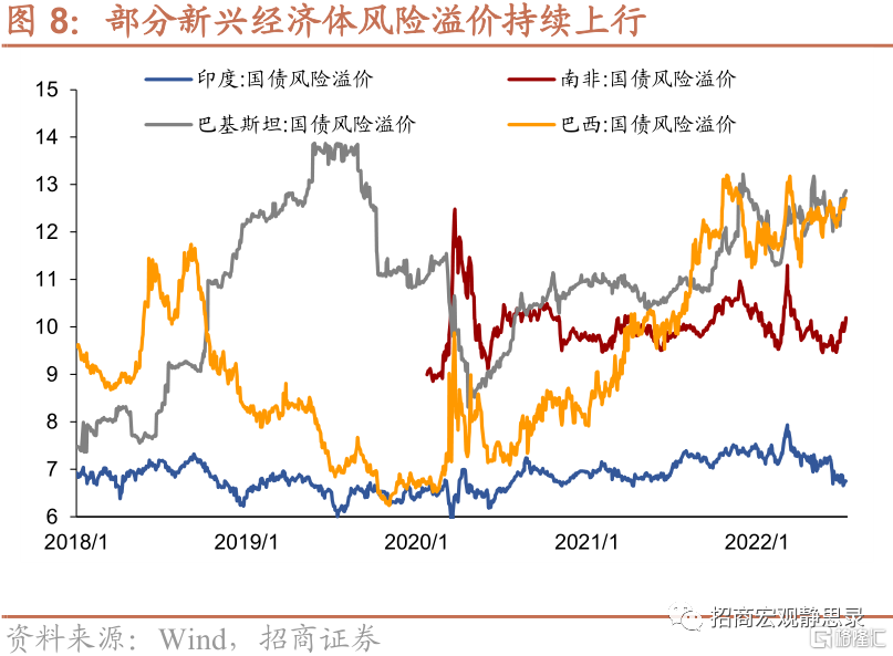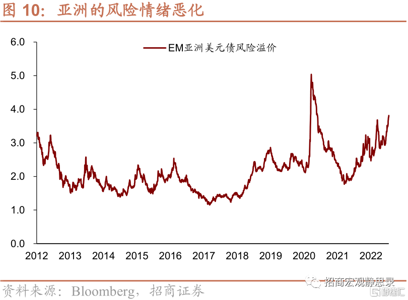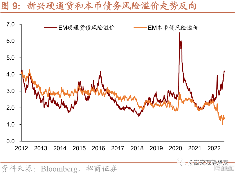 另一重因素是,市场亟需寻求美元的避险属性,因为美联储加息推升了新兴经济体的金融风险,斯里兰卡外债违约、巴基斯坦濒临违约等事件和我国房地产部门的金融脆弱性问题均形成了风险情绪冲击。6月以来,新兴亚洲美元债风险溢价波动中枢持续抬升;新兴市场硬通货债券风险溢价与本币债走势呈现反向(图8-10)。