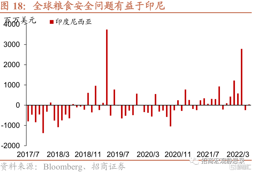 2)作为大宗商品出口国,特别是在今年全球粮食安全重要性提升后,印度尼西亚的资本流入态势明显,4月份的净外国股权投资流入高点达到27.8亿美元(图18)。相形之下,亚洲制造业国家之中,印、韩、日今年上半年的资本流出幅度尤其明显。