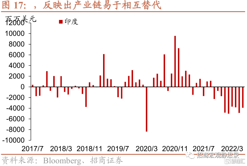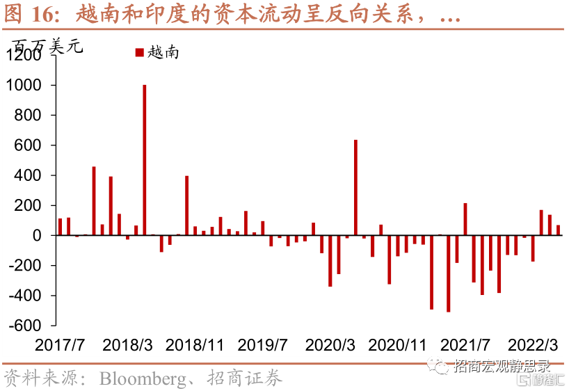 对于不同的新兴经济体,近年资本流动的逻辑分化明显。就亚洲经济体而言,1)如此前报告所述,疫情冲击后,亚洲价值链出现了由我国和日韩等提供中间品,在低劳动力成本的印度、越南等组装后出口的转型加速,这致使印度和越南的净外国股权投资整体上呈现出一定的反向关系(图16-17)。二者均在价值链易于相互替代的环节,因此如果印度出现主权债-银行-企业部门风险的集中暴露、国内疫情再起或供应链问题等,越南很可能仅受较小冲击,甚或受益。