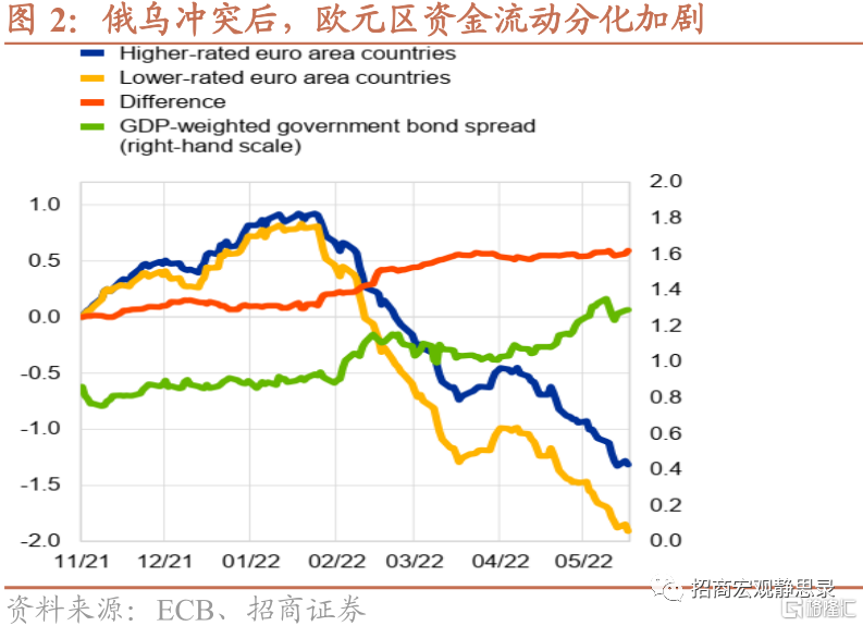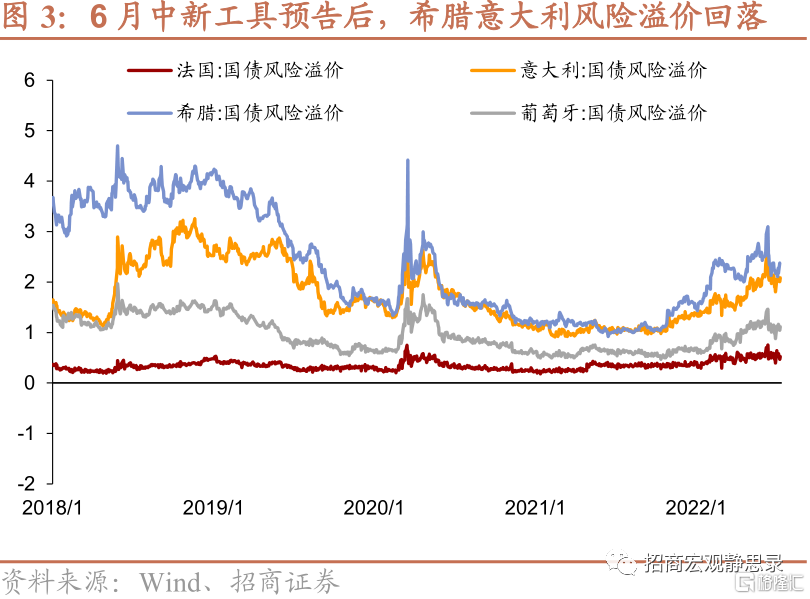 考虑到欧央行前两次加息所引发的2010年希腊主权债务危机和2011-12年的全面银行/主权债务危机,市场亦担忧欧元区在深陷衰退的同时出现金融风险的集中暴露。俄乌冲突后,欧元区不同评级的国家之间的债市资金流出差距扩大,同时主权债利差走阔,6月中希腊十年国债对德债利差高达310BP(图2-3)。6月15日,欧央行宣布将创建新的政策工具来应对欧元区的金融条件差异化风险,并预防反欧元情绪,对此市场预计新工具可参照2012年出台的直接货币交易计划OMT,该计划允许欧央行直接购买金融脆弱性较高国家的国债。这之后,欧洲各国对德债利差反映出风险溢价的明显回落。7月21日欧央行议息会所最终公布的传导保护工具TPI,为比OMT更易于大规模快速使用的强相机抉择类货币政策工具。