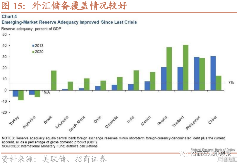 本轮加息周期中新兴经济体的风险情形不同于2013年。新兴经济体此前的问题常出在美联储收紧、利差走阔之后的美元债再融资和汇率波动,Guidotti-Greenspan认为新兴经济体的外汇储备需要覆盖12个月的短期外币外债和经常账户赤字,但是近期研究显示,当前新兴经济体央行整体上外汇储备对短期外币外债和经常账户赤字的覆盖情况较好,仅土耳其和阿根廷面临较高的此种风险(Davis,2021,图15)。