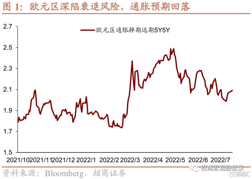 本轮美元走强始于,市场预期美联储的收紧政策步伐欧、英、日将难以跟随,特别是欧元区将深陷衰退、美欧经济增速之差会持续扩大,而随着内需走弱压低通胀,欧央行会在23-24年转为面对衰退、债务风险约束和通胀回落的情景。欧元区通胀掉期5Y5Y在5月初一度达到接近2.49%,7月初已回落至2.0%上下的水平(图1)。