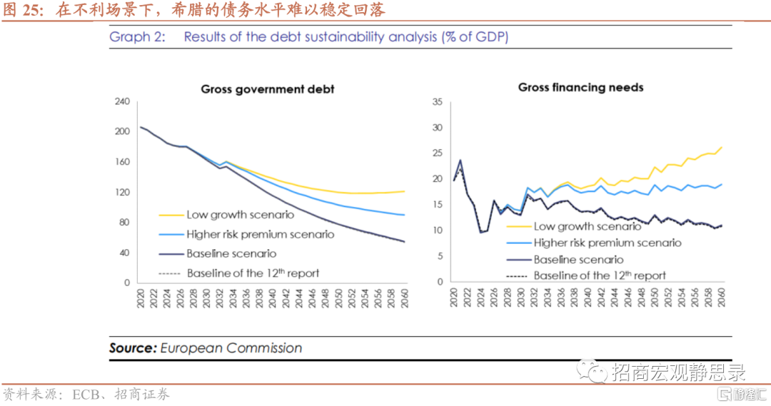 但在中长期,需特别警惕高通胀、利率上行和供给侧冲击的不利情景。欧央行仍在购买希腊国债,但利差在持续扩大;欧委会压测分析表明,尽管基线场景的债务率呈下行趋势,在不利的低增长场景,希腊的债务水平难以维持稳定回落(图25)。