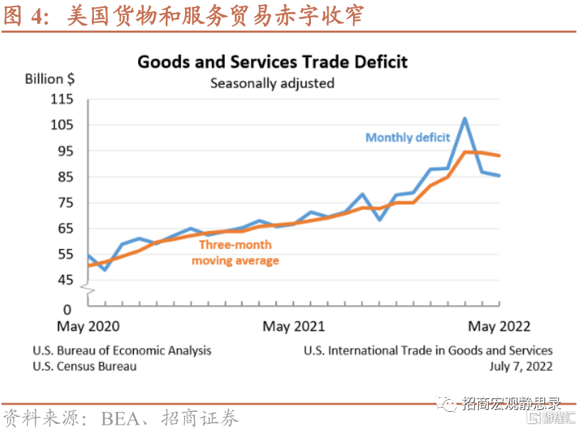 美国方面,随着经济动能从商品转向服务,其进口需求放缓、贸易逆差逐步收窄,而通胀居高不下、美联储预计将持续大幅加息,诸多基本面因素均在支撑美元走强。5月份美国货物和服务贸易逆差为855亿美元,较4 月下行 1.3%;其中货物贸易逆差下行29亿美元,至1050亿美元;服务贸易顺差下行17亿美元,至194亿美元。另外,6月份失业率持稳在3.6%、CPI同比升至9.1%,考虑到服务业通胀粘性和实际工资追赶,市场对美联储的加息预期强化,并且在一定程度上淡化了对衰退的担忧。