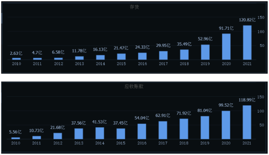 另一方面,则是歌尔股份不断飙升的存货及应收账款。2018年-2021年,歌尔股份存货金额由35.49亿元增长至120.82亿元,应收账款由71.92亿元增长至118.99亿元。