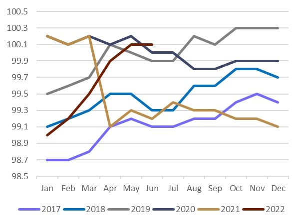 6月通胀数据 上周五日本公布了全国的6月CPI数据,综合CPI同比2.4% (前值2.5%、预期2.4%),核心CPI同比2.1% (前值2.1%、预期2.2%),相较上月并未发生明显变化。综合CPI同比的小幅下降来自于生鲜食品季节性的小幅下降,但其他非食品非能源的项目缺乏明显的上升也是日本通胀上升动力不足的原因(图表21)。从日本的核心核心CPI的指数走势来看,在过去2个月当中上升势头有所放缓(图表22),在此背景之下想要实现同比2%以上的上涨难度依旧不低。在此背景之下,我们认为在短期之内日本央行的货币政策仍大概率保持现有的宽松。