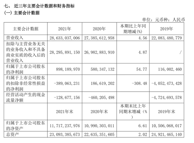 庞大主营业务为汽车经销及维修、养护。然而,如果不是靠频频卖资产,庞大2021年依然未走出亏损的泥沼。庞大去年净利润率为3.12%,但值得注意的是,庞大因股权转让事宜产生的投资收益就达14.18亿元,其扣非净利润为-3.89亿元,同比减少308.48%,扣非净利润率为-1.36%。