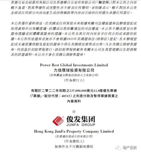俊发表示,集团正在评估其流动性状况、整体业务营运及经营环境,积极实施有效的流动性解决方案,同时密切关注形势。同时,集团亦将积极与债券持有人进行对话,以期寻找并实施各种方法来应对当前的流动性问题,努力达成一致的解决方案,从而最大限度地保护所有持份者的权益。