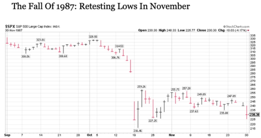 最后,11月的威胁也不应忽视,虽然从历史上看,它往往是一个积极的月份,因为股市一般会开始从此上升到12月,而12月是一年中平均最好的月份之一。但当股市跌势恶化时,跌势往往会延续到11月的头两周,甚至更长时间。下面的图表显示了这种情况在2008年秋天(创新低)和1987年秋天(创新低)是如何发生的。