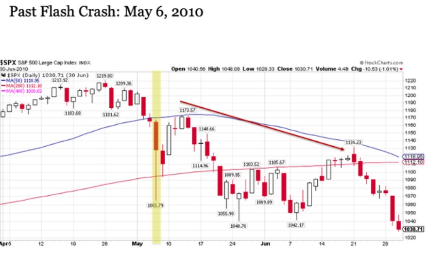 2010年5月6日,标普500指数突然暴跌近10%,随后迅速站稳脚跟,在交易日结束时收复了大部分失地。尽管标普500指数最终在5月中旬一路上涨,但50日移动均线却因闪电崩盘而被彻底打破,最终导致股市在重新测试这一关键阻力位时失败,然后回档下行。事实证明,5月6日的闪电崩盘预示着最终持续到6月底的进一步下跌。当时,美联储刚刚结束了它的第一个量化宽松计划,这让股市失去了投资者多年来熟悉并沉迷其中的流动性支柱。