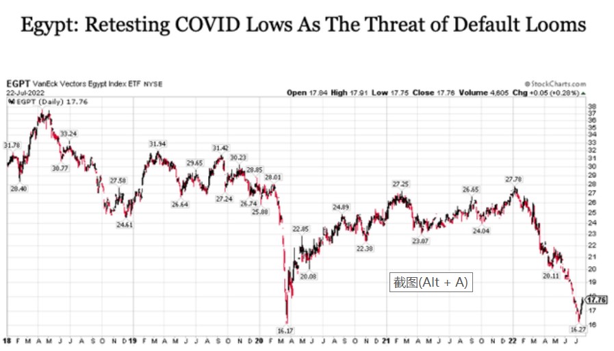 从现在到2022年底,另一个潜在的市场不稳定事件是,新兴市场许多主权借款人不断恶化的金融状况可能演变成一场全面危机,蔓延至全球发达市场,就像我们在上世纪90年代末看到的那样。有几个国家已经违约,包括最近的斯里兰卡,其他几个国家也面临着很高的违约风险,包括乌克兰、埃塞俄比亚、萨尔瓦多和加纳。但目前最值得密切关注的两个国家是巴基斯坦和埃及,它们对金融市场有着更广泛影响。对于这两个国家,它们的信用违约互换(CDS)在7月份都大幅超出了本已很高的水平。此外,两国的股市表明,未来可能会有更多的困难,因为两国目前都在重新测试新冠疫情时的低点,并似乎准备最终突破后继续下行。