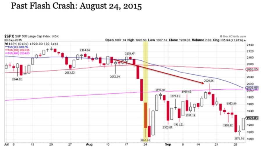 2015年8月24日,周一,标普500指数开盘后立即暴跌5%。不过,随后市场最终重新站稳脚跟,并收于开盘时低点,但在接下来的交易日再次测试闪崩低点。标普500指数在8月底前重新测试400日移动均线的支撑位,随后在9月回落至闪崩低点。是什么导致了此次闪崩?此时,美联储在不到一年前结束了第三次量化宽松计划,并准备加息25个基点,这是自金融危机爆发以来的首次加息。