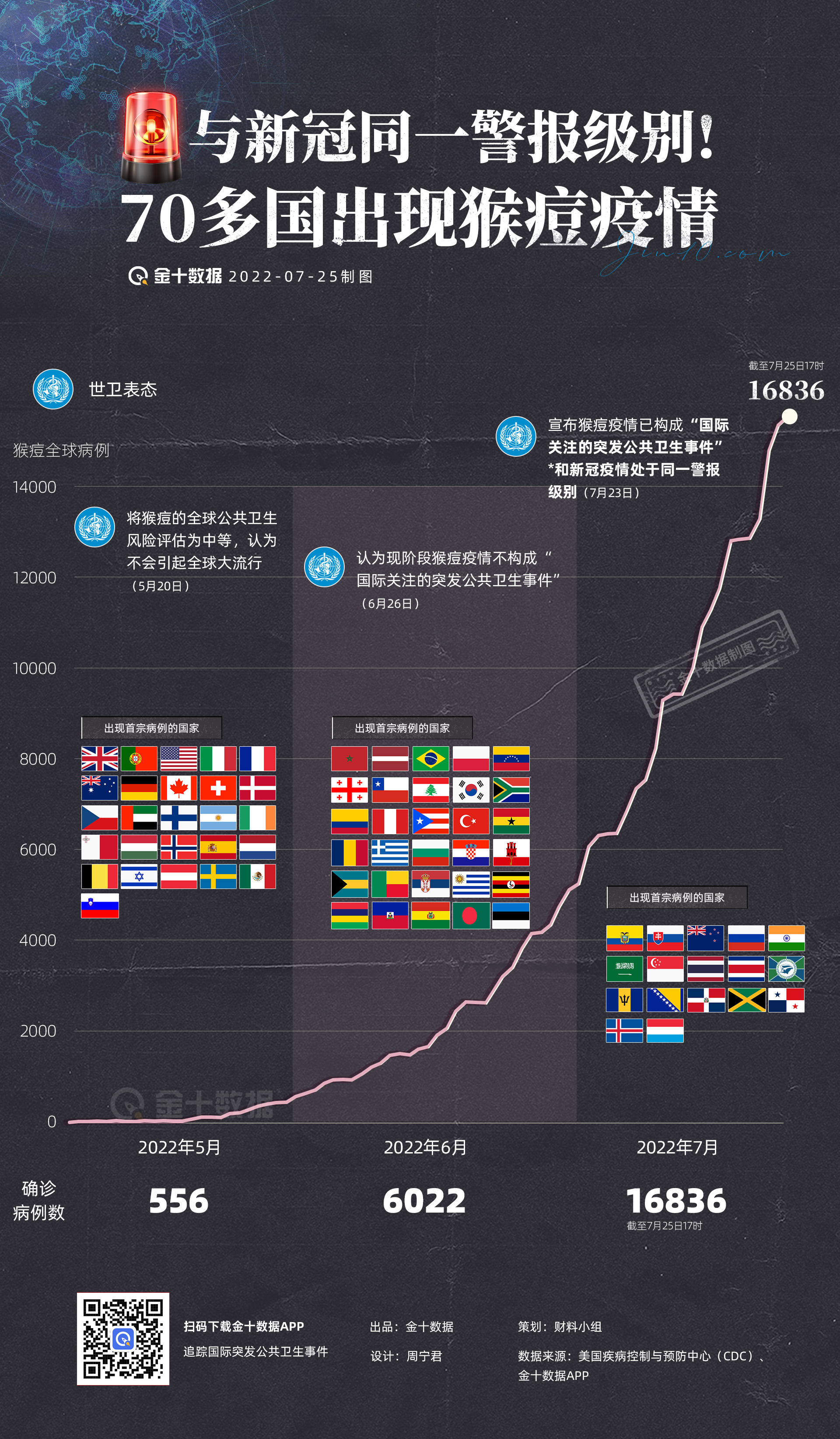 今年5月初,英国出现首例猴痘确诊病例,随后疫情在全球多地快速蔓延,短短三个月左右,已有70多个国家相继报道出现猴痘病例,截至目前全球累计确诊1.6万多例。世卫组织的表态也从5月份的“将猴痘的全球公共卫生风险评估为中等,认为不会引起全球大流行”转变成“猴痘疫情已构成‘国际关注的突发公共卫生事件’”,将猴痘疫情与新冠疫情划分为同一警报级别。